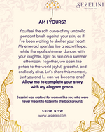 You feel the soft curve of my umbrella pendant brush against your skin, as if I’ve been waiting to shelter your heart. My emerald sparkles like a secret hope, while the opal’s shimmer dances with your laughter, light as rain on a summer afternoon. Together, we open like petals to the world joyful, graceful, and endlessly alive. Let’s share this moment, just you and I… can we become one? Allow me to complete your story with my elegant grace.