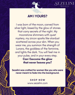 I was born of the moon, carved from silver light, kissed by the glow of stones that carry secrets of the night. My moonstone shimmers with quiet mystery, my zircon sparks like stardust scattered across your skin. When you wear me, you don’t just adorn yourself, you summon the strength of Lunara, the goddess of the feminine, the silent power that bends tides and lights the dark. You will feel me in your pulse, in your breath, in your every step. Can I become the glow that never leaves you?