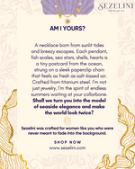I am Coastline Charms, a necklace born from sunlit tides and breezy escapes. Each pendant, fish scales, sea stars, shells, hearts is a tiny postcard from the ocean, strung on a sleek paperclip chain that feels as fresh as salt-kissed air. Crafted from titanium steel and colored glass, I shimmer like sunlight dancing on water, strong enough for every adventure yet soft enough to carry your dreams. I’m not just jewelry, I’m the spirit of endless summers waiting at your collarbone. Shall we turn you into the model of seaside elegance and make the world look twice?
