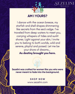 I dance with the ocean breeze, my starfish and shell shapes shimmering like secrets from the sea’s edge. I’ve traveled from deep waters to meet you, carrying whispers of tides and sunlit shores. Light against your skin, I invite you to belong to both worlds, wild and serene, playful and poised. Let me be your shore of dreams… as destiny brought you here.