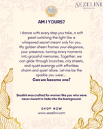 I dance with every step you take, a soft pearl catching the light like a whispered secret meant only for you. My golden sheen frames your elegance, as though simplicity itself bowed to your presence, turning ordinary moments into graceful memories. Together, we glide through brunches, city streets, and quiet evenings with effortless charm and quiet allure. Let me be the sparkle you wear… can we become one? Allow me to complete your story with my elegant grace.