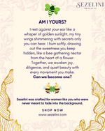 I rest against your ear like a whisper of golden sunlight, my tiny wings shimmering with secrets only you can hear. I hum softly, drawing out the sweetness you keep hidden, like a bee gathering nectar from the heart of a flower. Together, we awaken joy, diligence, and quiet beauty with every movement you make. Let me bring your gentle radiance to light… can we become one? Allow me to complete your story with my elegant grace.