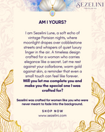 I am Sezelini Lune, a soft echo of vintage Parisian nights, where moonlight drapes over cobblestone streets and whispers of quiet luxury linger in the air. My smooth oval silhouette and opal glow were born from Art Deco dreams, a timeless design crafted for a woman who carries elegance like a secret. Let me rest against your collarbone, warm gold against skin, a reminder that even the smallest touch can feel like forever. Will you let me complete you and make you the special one I was crafted for?