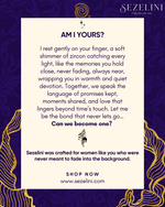 I rest gently on your finger, a soft shimmer of zircon catching every light, like the memories you hold close, never fading, always near. My open curve embraces the space where distance cannot reach, wrapping you in warmth and quiet devotion. Together, we speak the language of promises kept, moments shared, and love that lingers beyond time’s touch. Let me be the bond that never lets go… can we become one? Allow me to complete your story with my elegant grace.