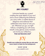 I shimmer beside you, a pearl cradling the quiet depth of your soul and a zircon reflecting the brilliance you carry within. Together, we are more than adornment, we are a union, a subtle dance of elegance and radiance that celebrates every facet of who you are. Wherever you go, our light follows, completing you with every breath, every glance, every moment. Let me be your reflection… can we become one? Allow me to complete your story with my elegant grace.