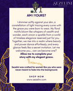 I shimmer softly against your skin, a constellation of light tracing every curve with the grace you were born to wear. My floral motifs bloom like whispers of wealth and wonder, each zircon a sparkle from a world of timeless elegance reserved just for you. Together, we rise into a realm where beauty and power dance effortlessly, and every glance feels like a secret invitation. Let me welcome you… can we become one? Allow me to complete your story with my elegant grace.