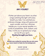 I flutter just above your heart, my silver wings catching the light with every breath you take. I’ve watched you embrace change, rising with grace and quiet wonder, and now I shimmer beside you, in your secret sparkle in a world of possibilities. Soft, radiant, and free, I invite you to spread your wings. Let me lift your spirit… destiny brought you here.