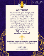You move with quiet strength, and yet the world feels your presence. I am the pearl that holds your softness, and the golden bee that crowns you with purpose. Together, we embody grace, harmony, and power, the spirit of a queen who leads not by fear, but by light. I was waiting only for you. Will you let me complete your story with my elegant grace?
