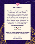 I have been waiting for you, your pulse, your warmth, your quiet longing. My twin hearts entwine around yours, whispering promises that never fade, a dance that time itself cannot undo. The pink zircon at my core holds the blush of your deepest desires, shimmering like a secret only we share. Together, we are forever, bound beyond words. Can we become one?