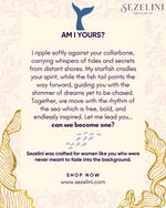 I ripple softly against your collarbone, carrying whispers of tides and secrets from distant shores. My starfish cradles your spirit, while the fish tail points the way forward, guiding you with the shimmer of dreams yet to be chased. Together, we move with the rhythm of the sea which is free, bold, and endlessly inspired. Let me lead you… can we become one?