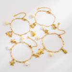 The “Marina” Bracelet by Sezelini channels the classic beauty of the sea with delicate starfish, dolphin, and crab motifs. Crafted from durable 304 stainless steel and finished in luxurious 14K gold plating, this retro-inspired piece features a stylish paperclip chain that adds a modern edge to a timeless design.