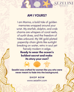 I am Marina, a bold tide of golden memories wrapped around your wrist. My starfish, dolphin, and crab charms are whispers of coral reefs, of sunlit dives, and the freedom of tides unbound. My 14K gold-plated paperclip chain glints like sunlight breaking on water, retro in soul yet fiercely modern in edge. I am not just a bracelet, I am a spark of oceanic power, a touch of playful courage, a reminder that you move like waves, unstoppable and radiant. Ready to wear the ocean’s boldest secret and make its story your own?