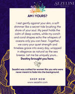I rest gently against your skin, a soft shimmer like a secret tide brushing the shore of your soul. My pearl holds the calm of deep waters, while my conch and coral shapes echo the whispers of oceans only you can hear. Together, we carry your quiet strength and timeless grace into every day, wrapped in elegance as natural as the sea breeze. Let me be uniquely yours… destiny brought you here.